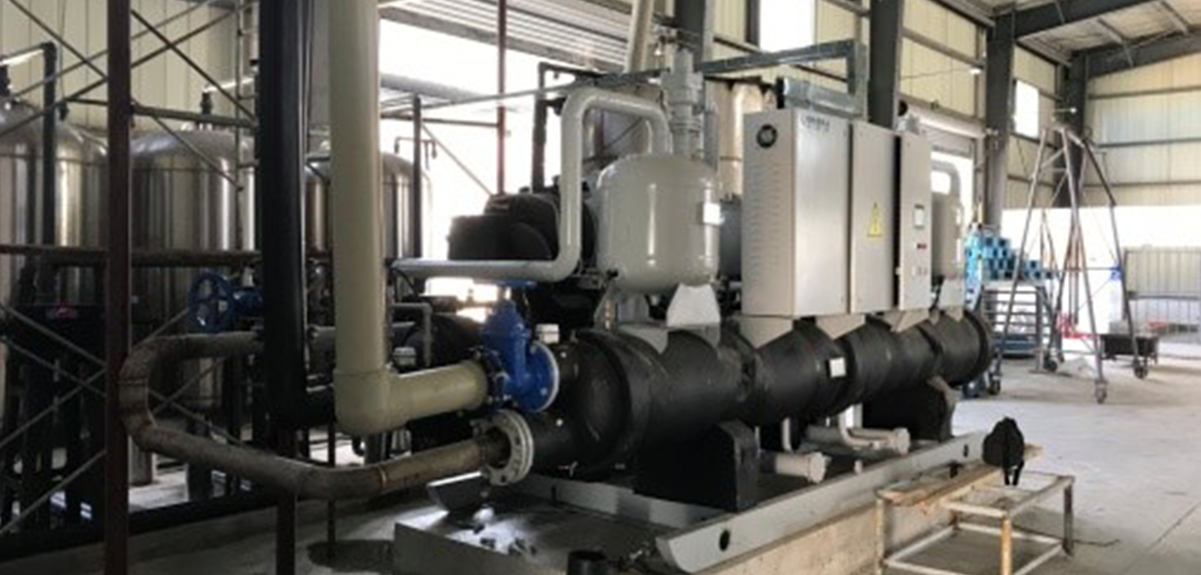 工生產車間,高氯酸鉀電解、蒸餾提純。機組採用1台漢鐘精機RC2-G系列餘熱接纳高溫熱泵壓縮機,用給電解液降溫的40℃左右的冷卻水作為熱源水,通過高溫熱泵提供70-80℃的熱水給蒸餾塔提供熱量,同時實現給電解液降溫至45℃左右。